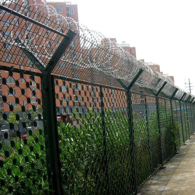 刀片滾籠采用刀片刺繩繞圈后相鄰兩圈每隔120度用刺絲連接卡固定,張開后形成蛇腹網(wǎng)狀,閉合后刀片刺繩卷徑為50cm,張開后每交叉圈安裝間距20cm,直徑不小于45cm。