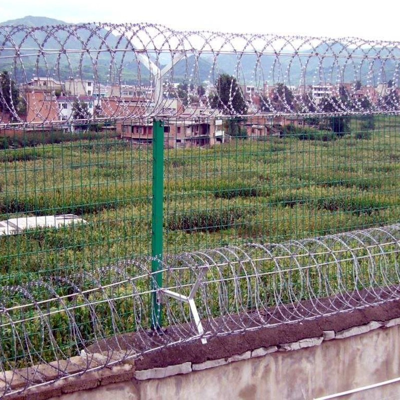 還有一些地方則采用刺繩圍欄,立柱和上面講的一樣,但是采用的是刺繩或者刀片刺網的形式。但一般用于監護部門。下面用圖片來表示更能一目了然。監獄護欄網用作圍墻增高網式,樣式一般上班要就刀刺滾籠,圍網也要求的比一般的要防攀爬,我帶大家看看各種樣式監獄護欄網的圍墻加高網。