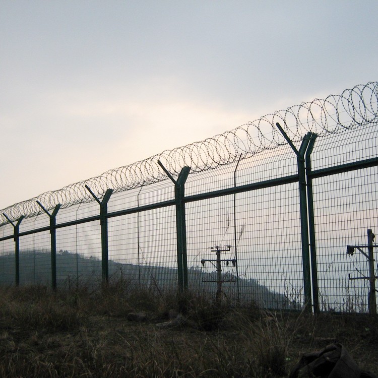 機場圍欄鐵絲網作為封閉圍墻的安全屏障,他的主要作用就是防止人翻越。機場圍欄網的防腐處理工藝是:除銹+防腐+浸塑。我廠對機場圍欄網的質量要求是立柱及邊框浸塑處理,使用專門]的PVC塑粉,表面做到無針孔、開裂、漏塑、塑液流淌等不良現象;顏色為草綠色、墨綠色、白色、灰色等。