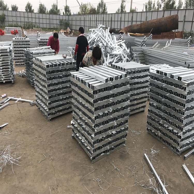 矩形鋼管上部焊接掛鉤采用長(zhǎng)度30mm絲徑5mm冷拔鋼筋制作,加密支架采用同樣與立柱支架的矩形鋼管制作,表面進(jìn)行熱鍍鋅處理,鍍鋅量270g/㎡。 階梯支架與立柱支架相應(yīng)采用材料一致,只是高度為1005mm,普通立柱支架為730mm,一般3m間距中間按一處加密支架以增牢堅(jiān)固性。