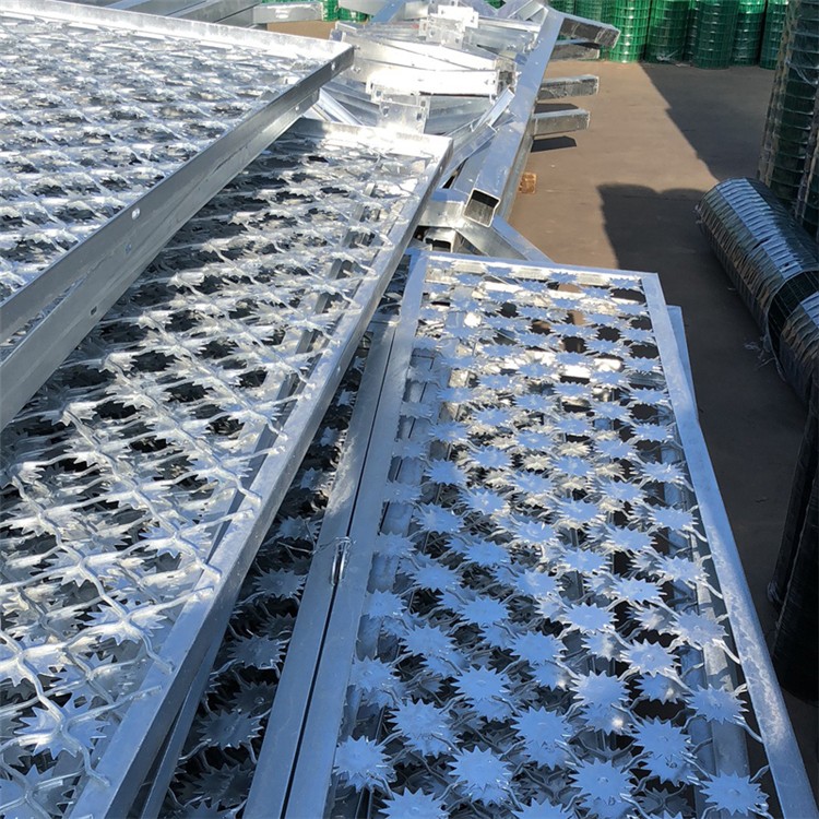 梅花刺網(wǎng)又稱監(jiān)獄護欄網(wǎng)或監(jiān)獄隔離柵,主要是采用高強度的刀片刺網(wǎng)與普通防護網(wǎng)的結(jié)合,由v型支架立拄,加強型焊接片網(wǎng),安全防盜連接件和刀片刺網(wǎng)組成.刀片刺網(wǎng)是種新型防護網(wǎng),由銳利尖角鍍鋅鋼板或不銹鋼薄板做刀片鋼絲做芯線組合而成的防護器材美格網(wǎng),又名防盜網(wǎng),制作工藝般為雙柱頭焊機(人工電焊已經(jīng)淘汰)。每個網(wǎng)格的對邊孔徑般為6.5cm-14cm。使用的鐵絲粗度一般從3.5mm-6mm,鐵絲材質(zhì)一般為q235低碳鐵絲。鐵絲經(jīng)過車花花煌接而成美格網(wǎng)黑片。網(wǎng)片的外形尺寸一般規(guī)格為1.5米x4米.2米x4米,2米x3米。