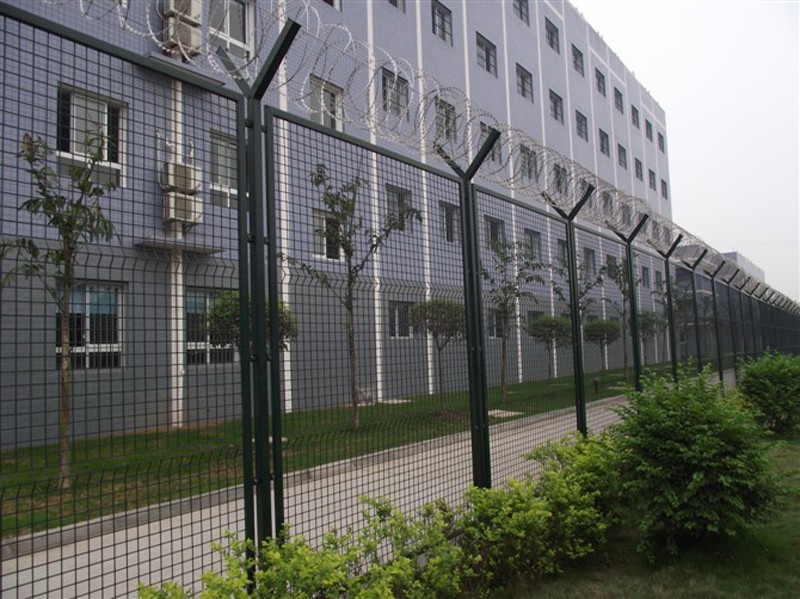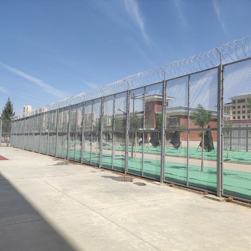 B.看守所護欄網立柱底座采用預埋方式安裝,預制預埋鐵件與立柱法蘭盤連接,立柱底座為200 mm *200 mm *10mm,預埋件四角預制四個直徑16mm熱鍍鋅螺栓(每個螺栓中心為距基礎兩邊150mm的交叉點),從頂端往下長度不小于150mm,螺栓高于底座平面50mm(底座平面應與所在位置最終地面高度在同一水平高度),螺栓間距200mm*200mm,與立柱法蘭盤螺孔相匹配。立柱保持豎直、不歪斜。