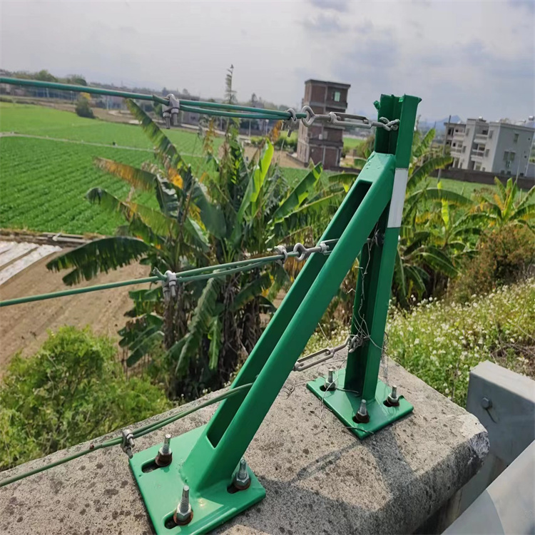 所有鋼構件采用熱浸復合涂層,管鋼帶、絲,平層附著量不低于600g/m2,平均層厚度不低于 0.084mm,浸塑涂層厚度大于0.3mm;緊固件,平均鍍鋅層附著量不低于350g/m2,平均鍍鋅層厚度不低于0.049mm,浸涂層厚度大于0.3mm。橋頭兩側及每間隔50m處各需焊接一個45°斜支架加強立柱穩定性。鋼絲繩施工張拉控制力不大于0.57KN,以鋼絲繩處于緊狀態為驗收標準。