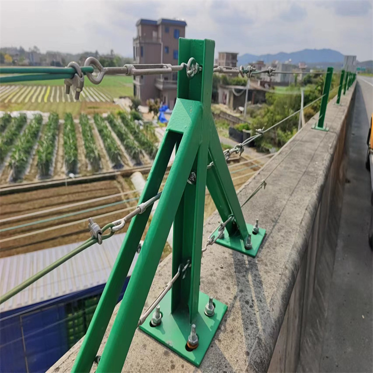 高速橋梁防拋網通常采用立柱焊接網之類的金屬護欄網。當然在高速公路兩側的漿砌石當土墻上還有一種防護設施——高速橋梁繩索護欄網,也叫做鋼絲繩防護網。