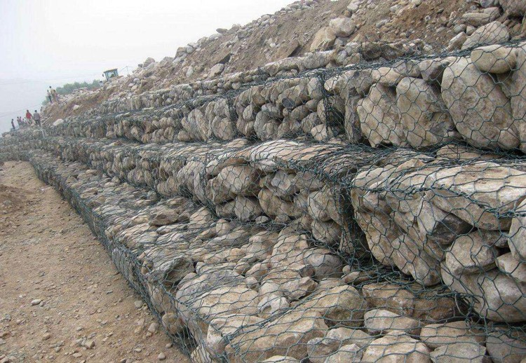 3、空籠安放,連接綁扎其它網(wǎng)箱單元根據(jù)放樣線按設(shè)計(jì)要求擺放網(wǎng)箱到位,并將每套網(wǎng)箱與上下、左右相鄰的河道石籠網(wǎng)箱進(jìn)行雙股綁扎,在邊絲與邊絲、邊絲與網(wǎng)片相鄰處進(jìn)行綁扎。