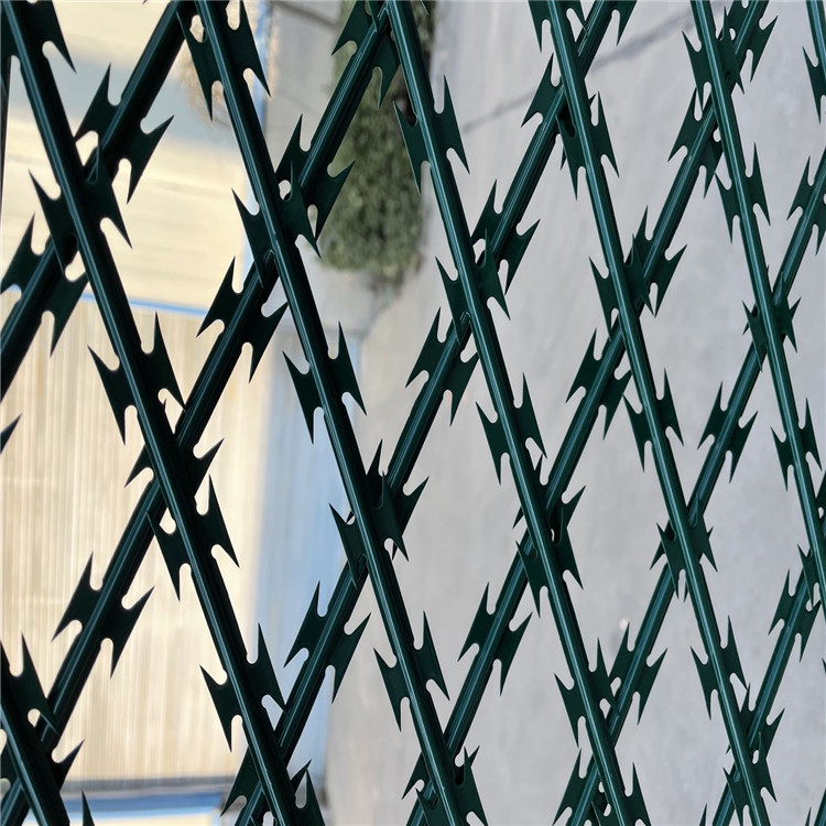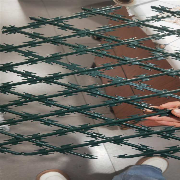 監獄防攀爬焊接刀刺網鋼網墻的網片是由刀刺繩機械自動焊接而成。他的材質有304不銹鋼和鍍鋅材料兩種。304不銹鋼材料的焊接網片同樣需要304不銹鋼的邊框,為什么不能用鍍鋅材質的呢?是因為在焊接的過程中會破壞掉邊框的鋅層,大大降低了工件的防腐性能。所以只能選擇304不銹鋼的邊框。在焊接的過程中雖然不會出現破壞工件表面的問題,但是在焊接點會有明顯的黑色焊接痕跡。所以在焊接完成后我們會進行表面處理。這種處理方式也有三種,在上篇文章中已經講過。如果工件的數量較少可以采用在焊點處噴銀白粉末進行防腐處理。如果選用鍍鋅材質的刀刺網來焊接網片,那么工件的表面處理就只能是噴塑,為什么不能是浸塑呢?如下圖所示第一張圖為噴塑,第二張圖為浸塑。噴塑很浸塑的防腐性能都很好,但是浸塑后的刀片鋒利程度會大大的降低,與產品的特性相悖。所以只能選擇噴塑來保證產品刀鋒的鋒利度。以上的內容希望為你今后對產品的選擇有更進一步的幫助。
