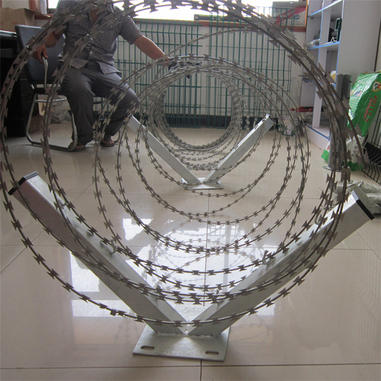 蛇腹形刀刺網利用“V”字型支架牽引的熱鍍鋅鋼絲在刀刺網圈內進行固定,牽引鋼絲數量不少于4根,刀刺網與鋼網墻網片間距不大于50mm.