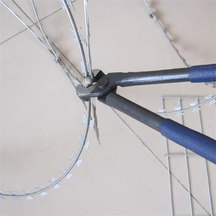 刀片刺絲,刺絲滾籠,是一種新型防護網(wǎng),該產(chǎn)品具有嚇阻效果好,美觀,施工便利,經(jīng)濟實用等優(yōu)點,主要用于園林公寓,機關(guān)單位,哨所,邊防等的圈禁防護,也可用于民宅,工廠,學(xué)校,小區(qū),園林公寓等的安全防盜防護,刀片刺網(wǎng)是由銳利尖角的鍍鋅鋼板或不銹鋼薄板做刀片,高張力鋼絲或不銹鋼絲做芯線組合而成的阻絕器材.由于刺網(wǎng)造型特不易觸摸,因而能打好很好的防護隔離盜賊的效果。