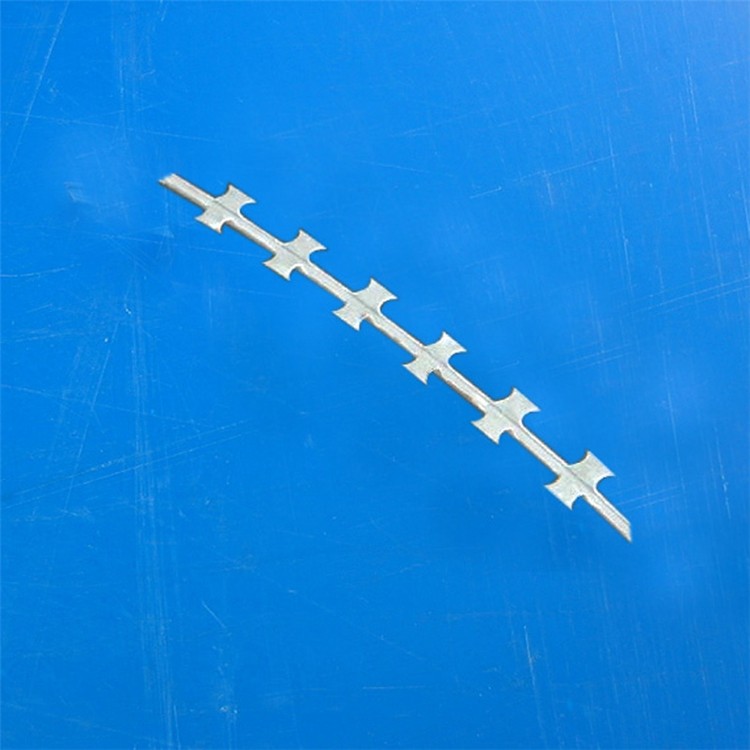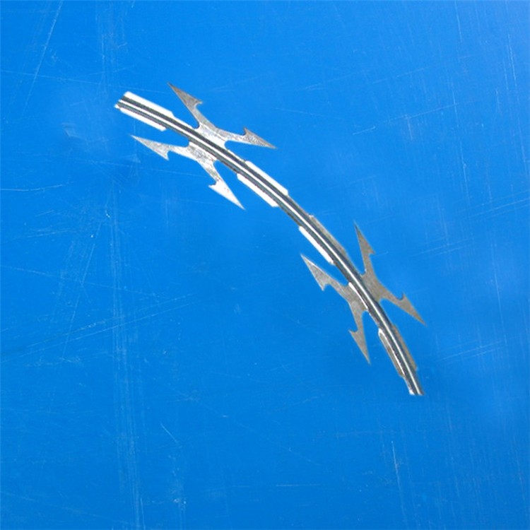 工藝:它采用熱鍍鋅帶鋼(刀片)沖壓成型包附于熱鍍鋅鋼絲(芯線)之上,由銳利尖角鍍鋅鋼板或不銹鋼薄板做刀片,高張力鋼絲做芯線組合而成的。