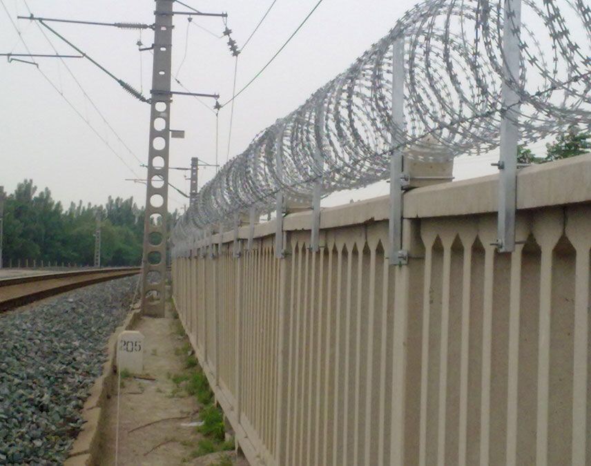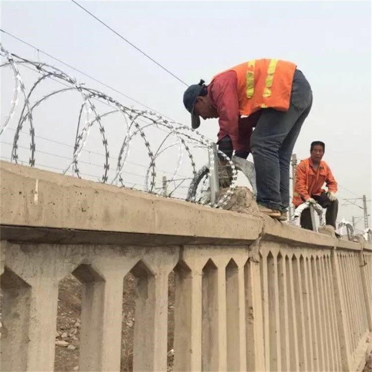 刺絲滾籠也叫刀刺滾籠,由刺絲連接卡扣與固定在支架上的縱向拉筋相連接,縱向拉筋與支架的連接采用直徑2.5mm的冷拔鍍鋅鋼絲繞2圈后擰緊固定。支架設置在跨度3m防護柵欄的立柱和跨中位置,刺絲滾籠跨度僅設置于立柱上部,支架與防護柵欄采用支架抱箍連接。