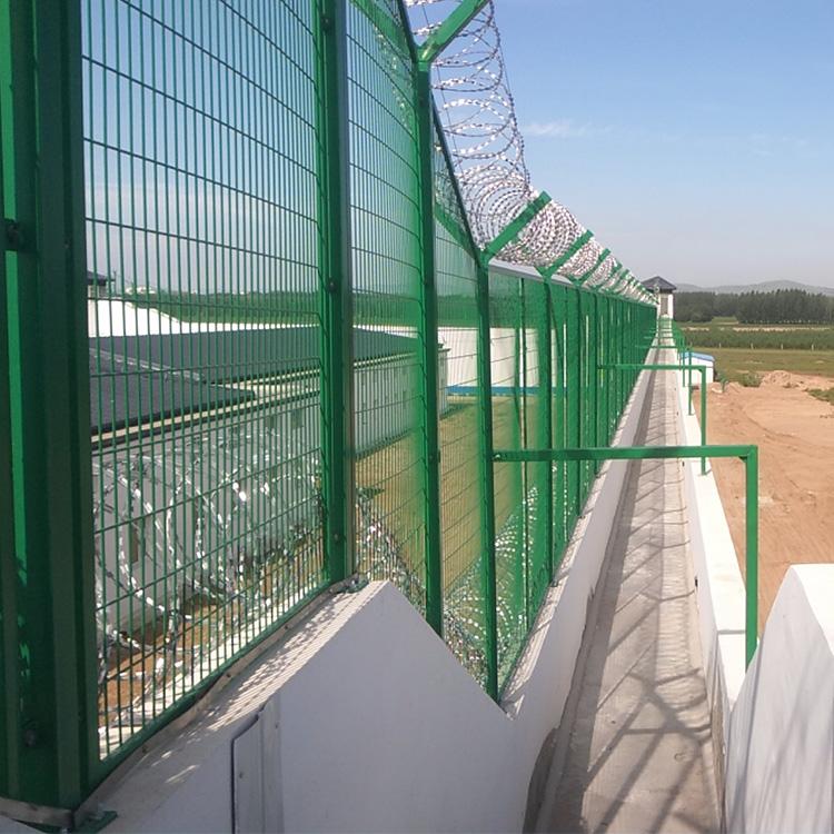 監獄安全圍網又稱監獄隔離柵,監獄防護網,監獄鋼網墻,監獄防攀網,監獄圍墻網等,主要是采用高強度的刀片刺網與普通防護網的結合,由V型支架立拄,加強型焊接片網,安全防盜連接件和刀片刺網組成。