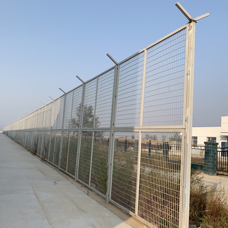 2.看守所巡邏道鋼網墻V型支架刀刺網固定采用貫穿式連接,每隔20米左右固定橫向拉絲,立柱一定要做調直處理,每20米校直一次,每100米偏差角度不大于6°,整體安裝無傾斜,隔離網整體呈直線狀態。【除去特殊地形需要做出適宜角度外】