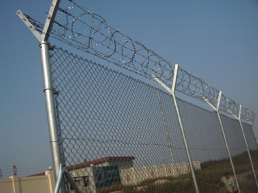 防護區(qū)周界柵欄主要由立柱、支撐、編織網(wǎng)、曲臂、刺絲、刺刀籠、系緊裝置及固定裝置等構(gòu)件組成。