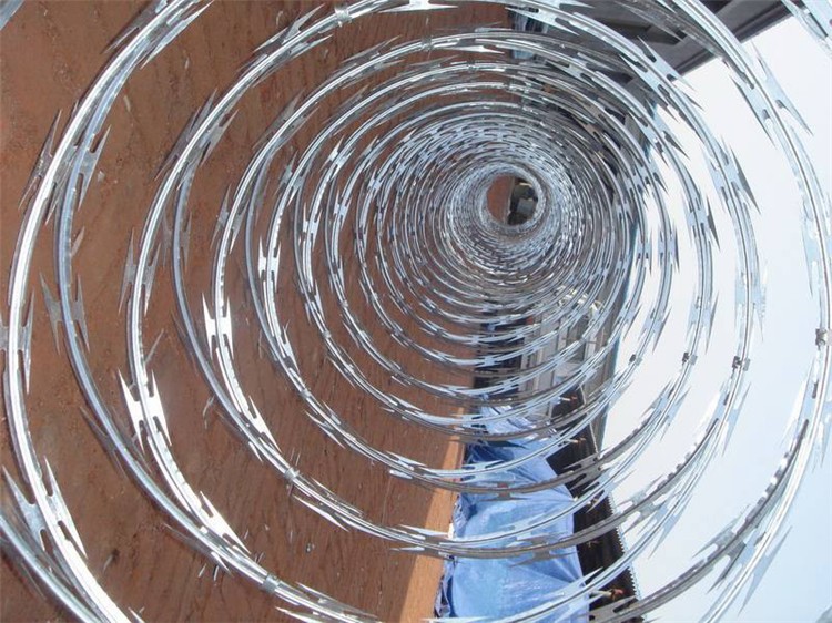 圍墻倒刺鋼絲網的直徑一般是50公分和60公分。我廠備有大量現(xiàn)貨,當天可發(fā)貨。刀片刺繩為熱鍍鋅鋼板經過沖壓而成的刀片形狀的防護網,圈經為50厘米,螺旋覆蓋長度為10米-12米。